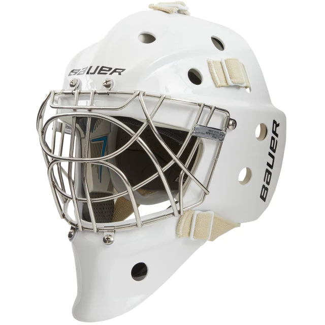 Features a new elite level Fiber Comp shell. New small sizing available to fit all goalies properly. Comes in Small, Medium and Large. New stretch spandex chin cup with new vision wire and a new backplate.