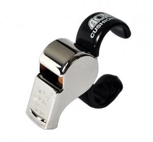 Thunderer official whistle of the CHL. Large metal whistle with adjustable finger grip and tapered mouthpiece.