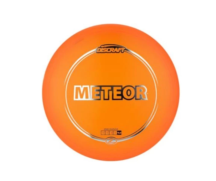 Meteor – Midrange: Speed 5 | Glide 5 | Turn -3 | Fade 1 | Stability -0.5. Please note: disc and foil colors will vary, weight range 160-178.5g. The Meteor is an understable midrange designed for glide and effortless straight flights. In Z blend, the Meteor will break in slowly into an easy turning