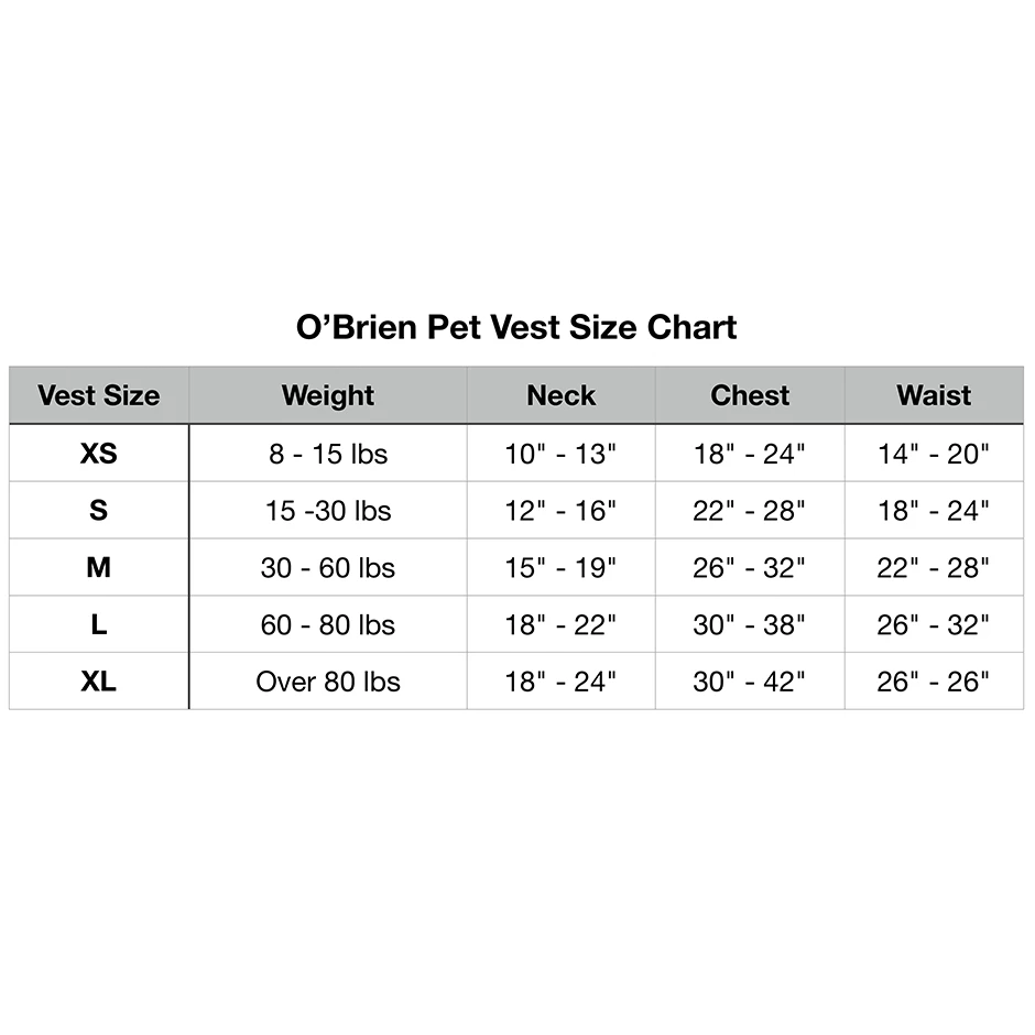 Does your dog love being on the water as much as you do? Keep them safe with the O’Brien Pet Vest. Designed for dogs of all shapes and sizes, this vest features one neck buckle and two adjustable ladder locks to fit securely around your furry friend while they are playing in the water. This vest also includes a strong nylon handle on the back to make for easy water retrieval. Check out the size chart to see which Pet Vest will suit your dog’s needs.