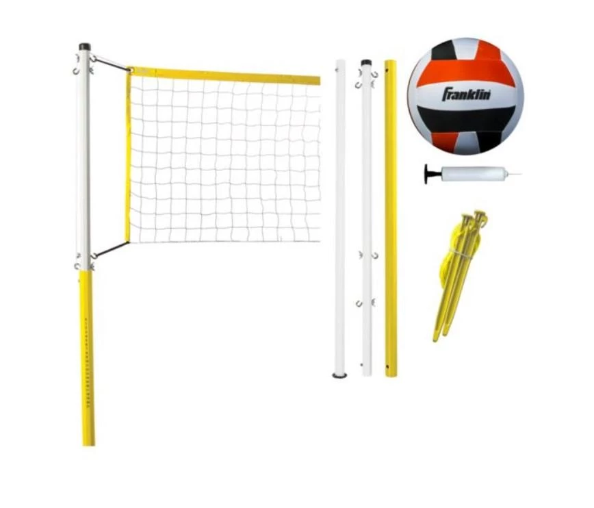 The Franklin Sports Family Volleyball Set includes everything you need to get the game started. Volleyball net is 20′ x 1.5′. Poles are 1.25″ in diameter This set includes the net, poles, one polyester volleyball, 8″ poly stakes, an inflating pump, and a carry bag with handles.
